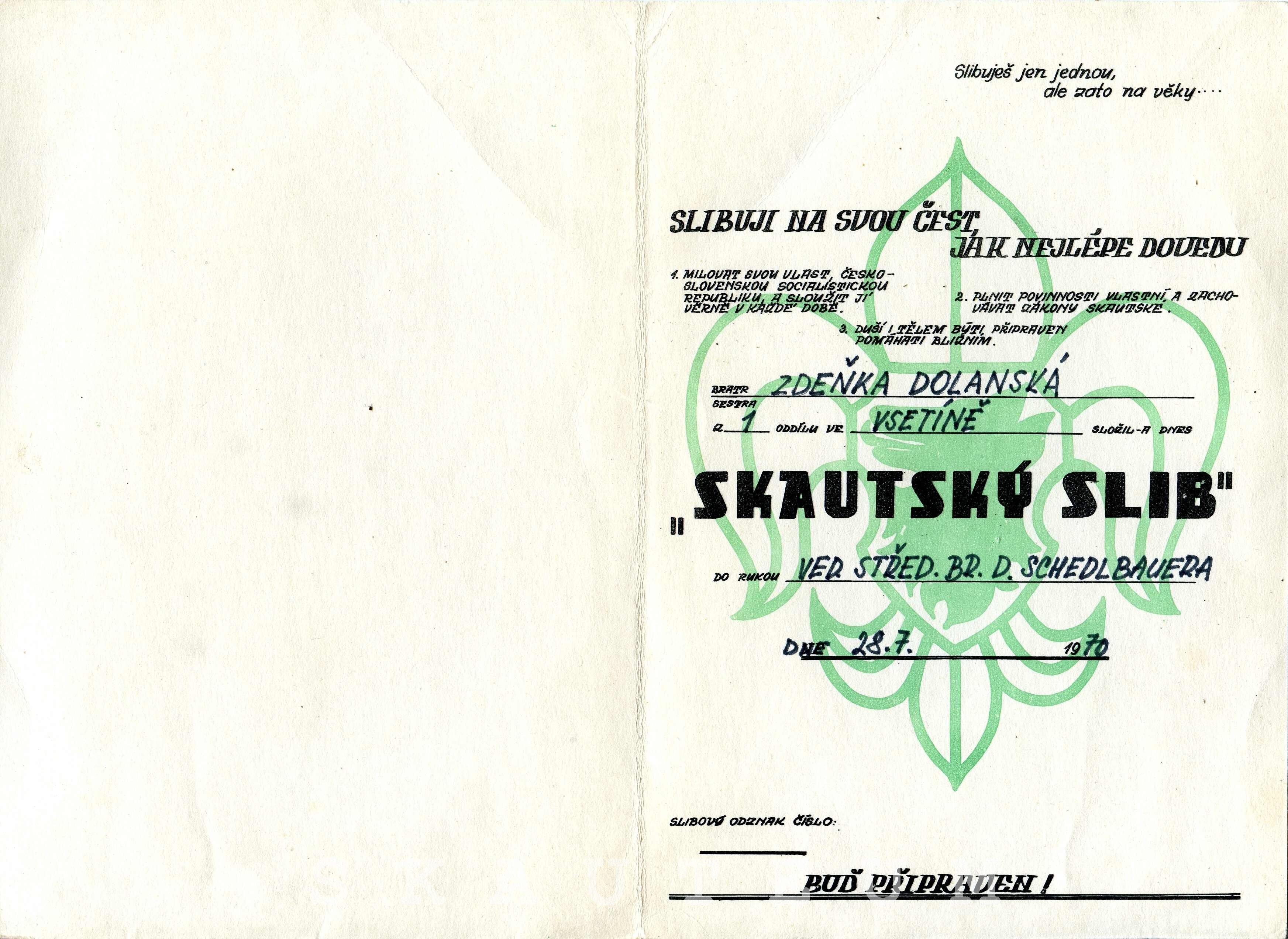 Bezesporu nejslavnostnější chvíli prožijí skauti při skládání svého slibu. Jako památku na tuto chvíli opatrovala Zdeňka Dolanská svou slibovou lilii a dekret skoro padesát let. Vzpomínky na ty kouzelné okamžiky jsou uchovány i v popelu slibového ohně, pečlivě zašitého v maličké kapsičce.