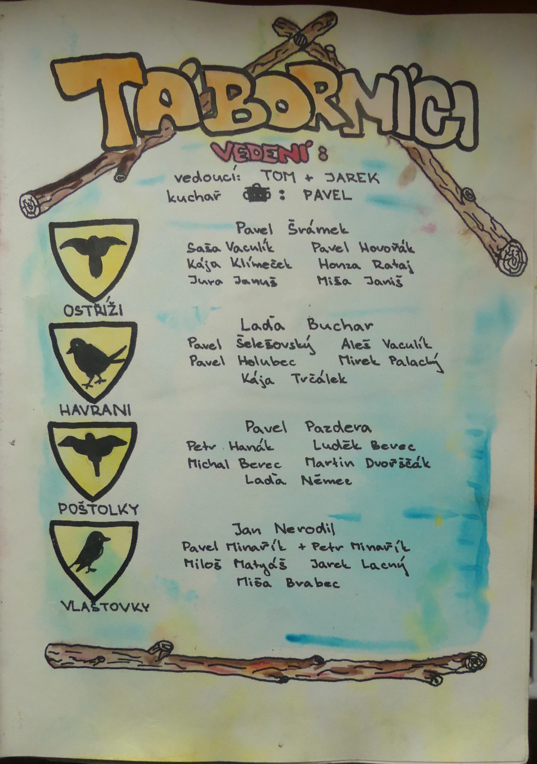 Za dvě hodiny už je základní půdorys tábora narýsován. Stany tvoří obdélník, jeho jedna strana je vyhrazena tzv. plecháčům, dostane se i na tradiční jehlan, ve kterém je situována marodka. Rodiče odjíždějí, ale my zůstáváme a před námi jsou tři týdny těsného soužití s Dynčákem, okolními kopci a taky s potokem, k němuž nás spolehlivě odesílá signál dvou dlouhých písknutí, tedy v morseovce em jako mytí.